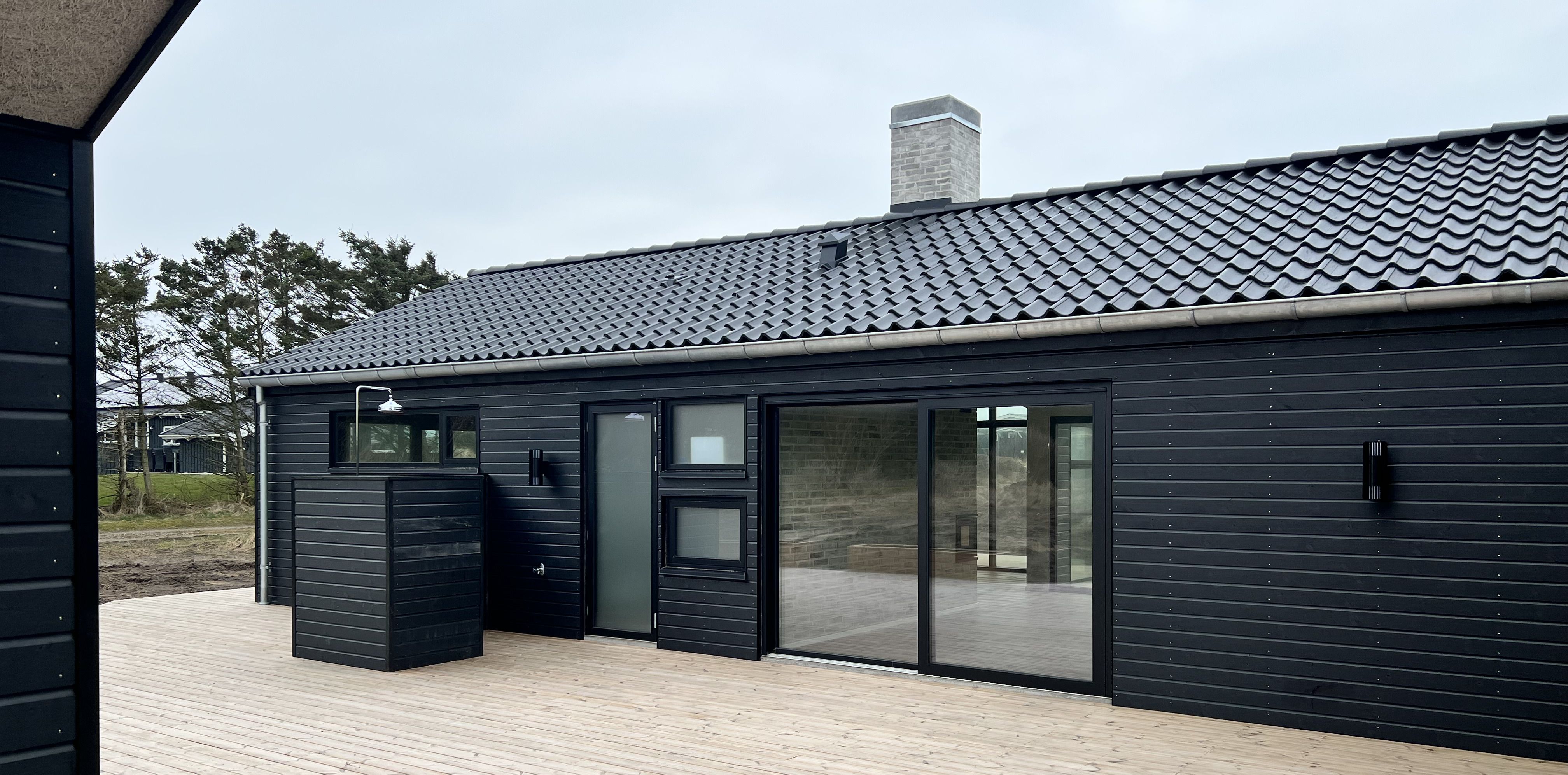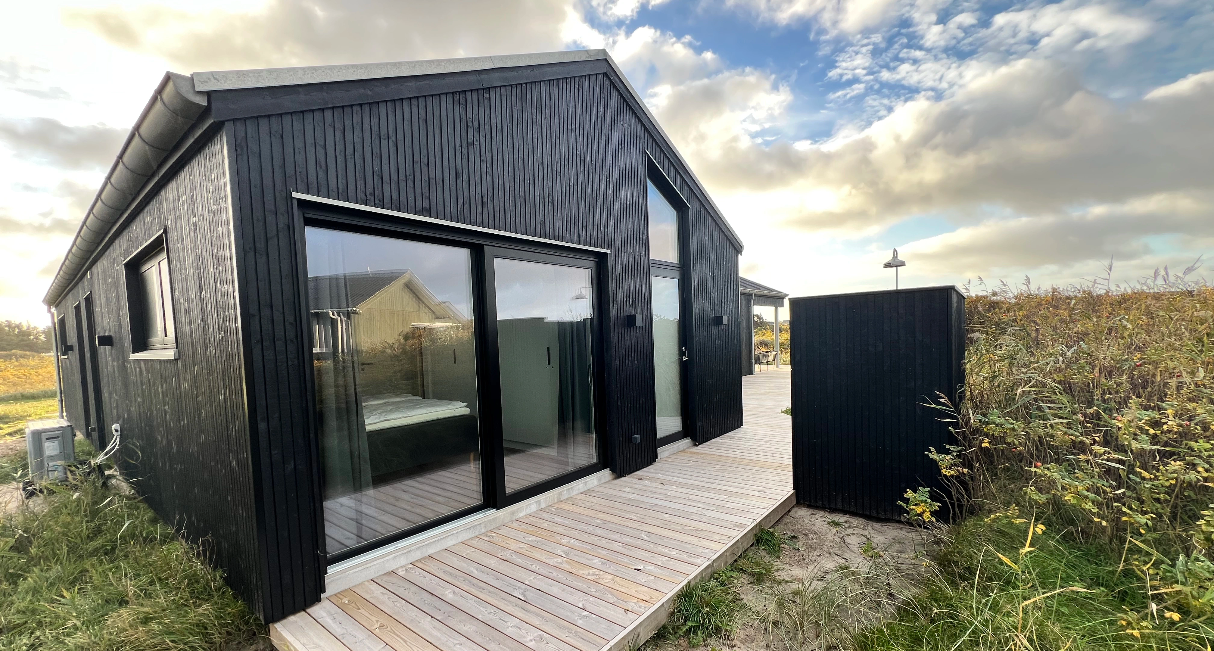 - Nyt sommerhus med stålpladetag, beklædning af termowood, store glaspartier - Saksild Strand
